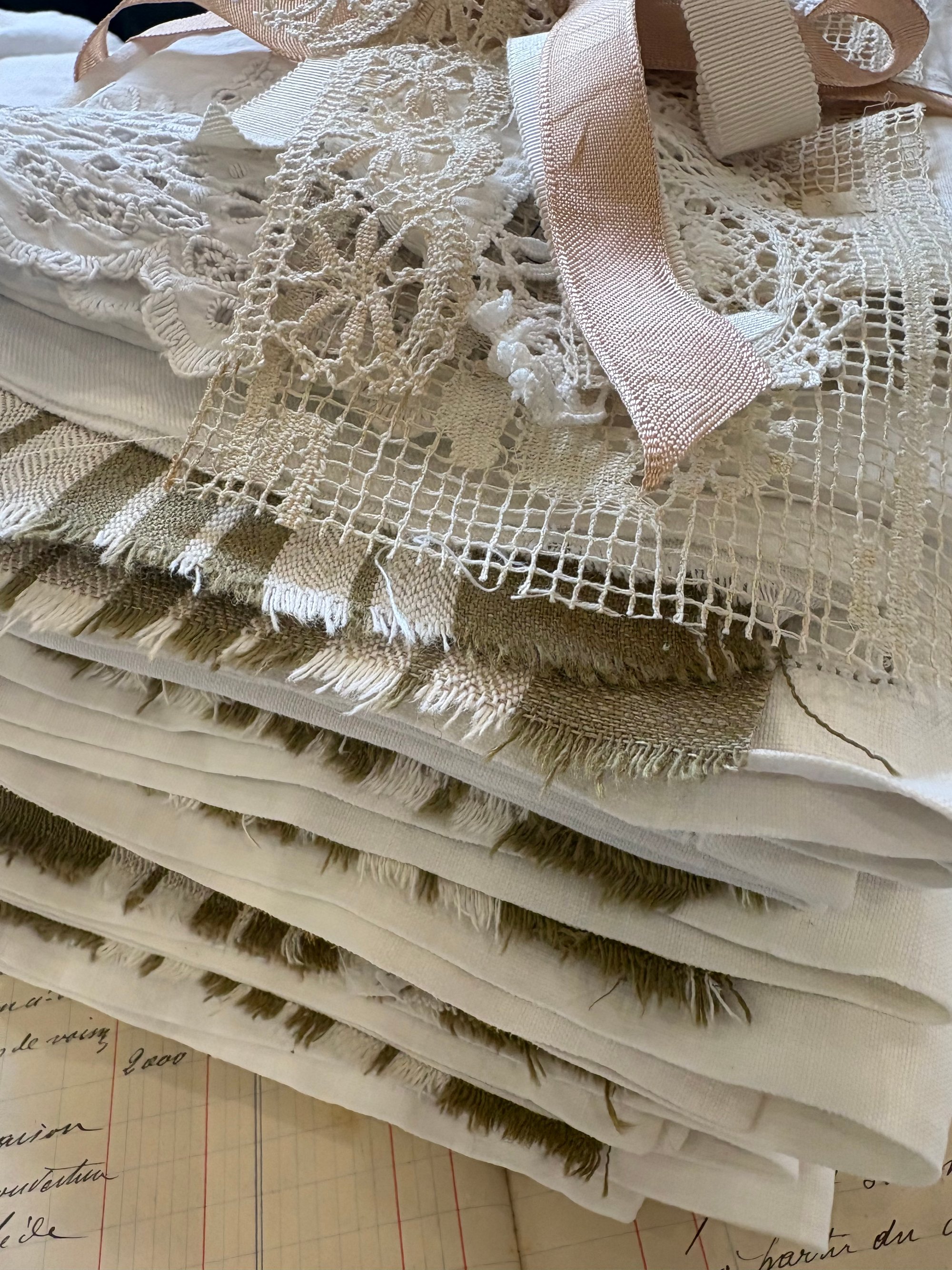 Neutral collection of French fabric and lace , slow stitching, neutral fabric, French fabric, journa